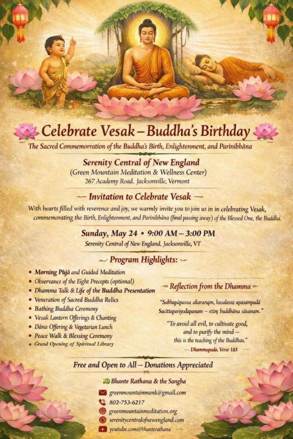 Led by Buddhist Monk Bhante Rathana and Yoga Instructor Loretta Richardson, this retreat welcomes both beginners and experienced practitioners. It is a gentle invitation to slow down and reconnect. Through meditation, yoga, time in nature, and mindful community eating and living, we will cultivate harmony in body, mind, and heart. In silence, in movement, and in the shared presence of compassion-based teachings, participants will experience reflection, connection, and inner stillness within a peaceful and supportive environment.
